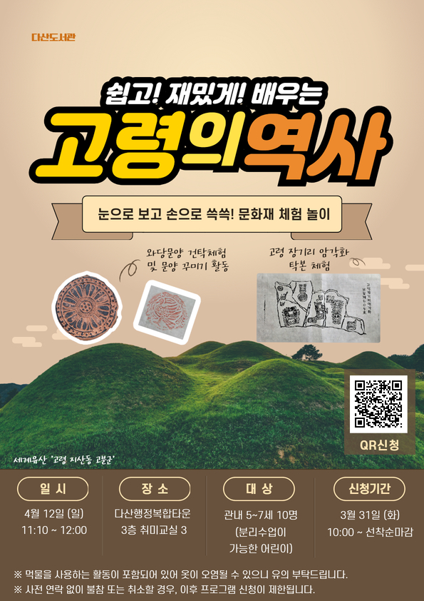 | 제목 | 2026년 4월 도서관의 날 쉽고!재밌게!배우는 고령의 역사(5~7세) 행사 프로그램 안내 | ||||