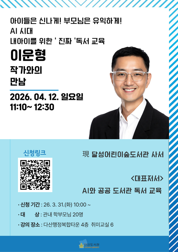 | 제목 | 2026년 4월 도서관의 날 이운형 작가와의 만남 프로그램 안내 | ||||